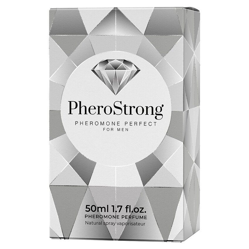 PheroStrong – parfum bărbătesc cu feromoni, 50 ml. Note de vârf: cardamom, piper roz, frunze de violet; inimă de salvie, vanilie și castan; bază de mosc. Prezență discretă, persistentă și sigură, conformă pentru zi și seară.
