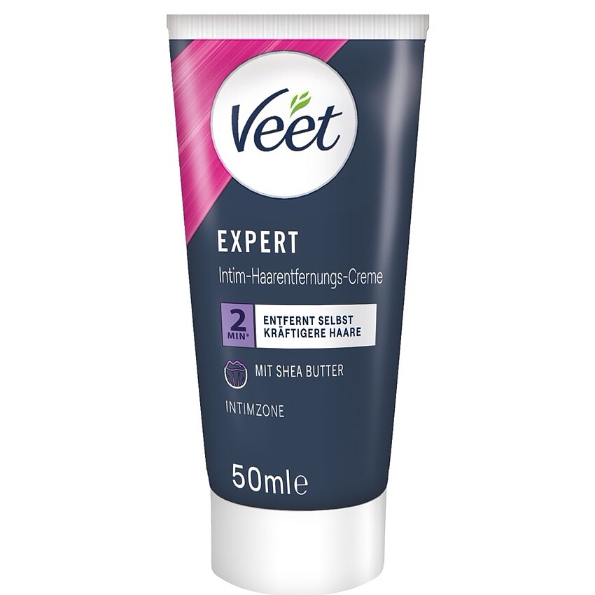 Set Veet EXPERT pentru zona intimă: cremă depilatoare 50 ml (spatulă inclusă) și spumă multifuncțională 50 ml. Îndepărtează firele groase în circa 2 minute, hidratează până la 48 ore și calmează dermă sensibilă.