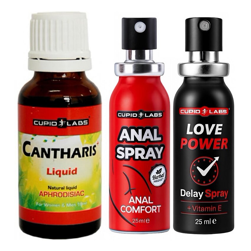 Detalii esențiale ale produselor: - Love Power Delay 25 ml (Cupid Labs): spray pentru amânarea ejaculării, aplicare rapidă, concluzie de desensibilizare locală. - Spray Desensibilizator Anal 25 ml (Cupid Labs): acțiune relaxantă asupra sfincterului, conceput pentru a face penetrarea mai ușoară și mai plăcută. - Cantharis Plus 20 ml: picături afrodisiace naturale, administrare orală sau în băutură, rezultat în ~30 minute, unisex.