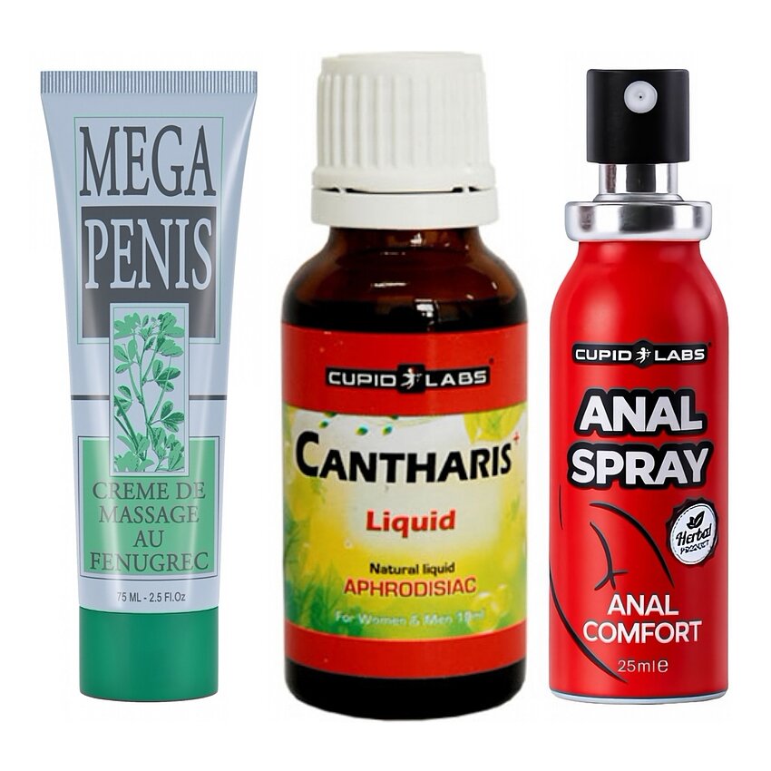 Cum le folosiţi împreună: administraţi Picăturile Cantharis Plus (20 ml, Cupid Labs) cu 30 de minute cândva de întâlnire — 10–15 picături în absolut orice băutură sau sub limbă; nu mai mult de două sesiuni în 24 h. În timpul preludiului folosiţi Cremă Creștere Mega Penis (75 ml, Ruf) pentru un frecție tonic al glandului și al tijei (aplicaţi pe pielea sănătoasă, evitaţi glandul, masaţi până la absorbţie); crema îmbunătăţeşte circulaţia şi conferă fermitate. La momentul penetrării anale, aplicaţi Sprayul Desensibilizator Anal (25 ml, Cupid Labs) local, câteva pulverizări, pentru relaxare şi reducerea disconfortului. În combinaţie, dropsurile amplifică dorinţa, crema oferă încredere fizică, iar sprayul schimbă experienţa anală în una mai blândă.