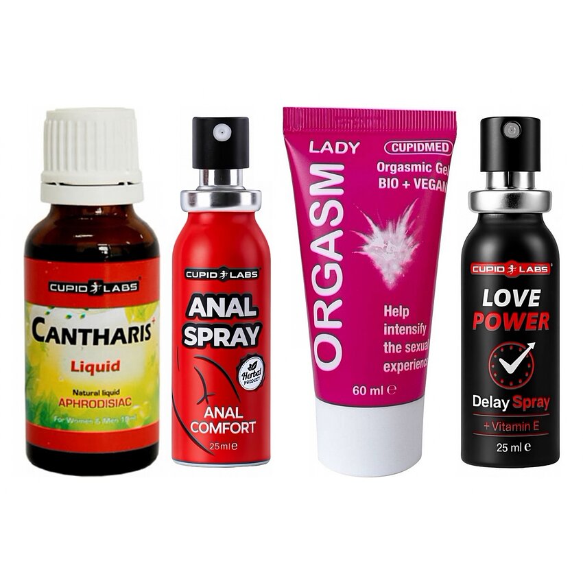 Detalii fabricat și beneficii: - Love Power Delay 25 ml: spray pentru masculi care reduce temporar sensibilitatea, oferind mai mult control asupra momentului climaxului; administrare simplă, câteva pulverizări locale cândva de contact. Desăvârșit pentru a elimina anxietatea legată de performanță. - Spray Desensibilizator Anal 25 ml (Cupid Labs): făcut pentru confort în timpul actului anal, contribuie la relaxarea mușchilor și la reducerea senzațiilor neplăcute; se aplică extern la intrare și se lasă să acționeze câteva minute. - Gel Orgasm Lady 60 ml (Cupid Labs): gel pentru femei, minus parfum, hipoalergenic; dăruiește trăiri de încălzire și furnicături plăcute, sporește sensibilitatea locală și intensifică plăcerea în timpul stimulării. - Picături Cantharis Plus 20 ml: afrodiziac pe bază de plante, pentru el și ea; administrare recomandată 10–15 picături în lichid sau sub limbă cu ~30 minute premergător întâlnirii intime; intensifică dorința și dispoziția de energie.