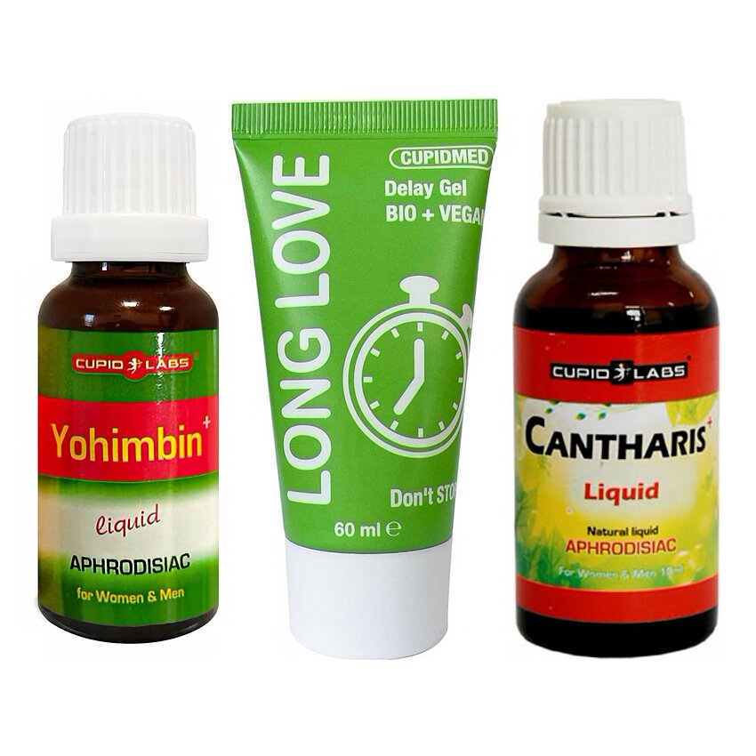 Redescoperiți intimitatea: kitul combină un gel pentru prolongația actului cu două tincturi normale care crește dorința și forța. Se folosesc complementar — picăturile cu 30 minute înainte, gelul aplicat local 20–30 minute înainte.