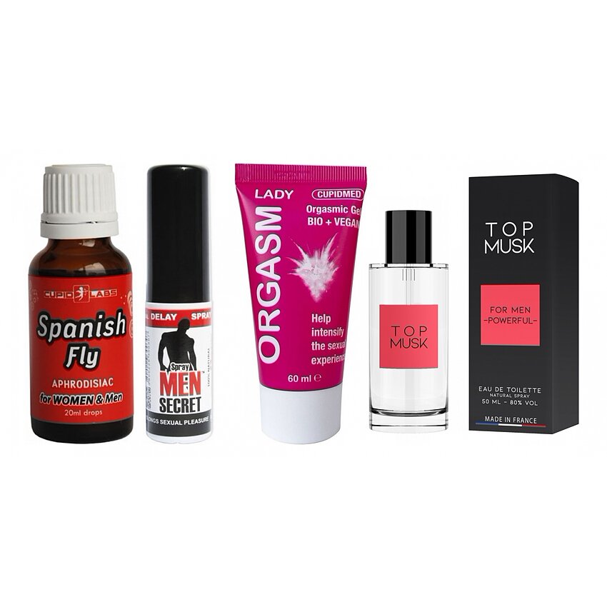 Cum să folosiți pachetul pentru cele mai bune rezultate: - Începeți cu esența de hormoni de atracție cu aromă de mosc (50 ml): câteva pulverizări pe încheieturi, gât sau pe haine creează o aură seducătoare și sporește atenția partenerului. Aroma masculină amplifică încrederea și deschide apetitul pentru apropiere. - Pentru a stimula libidoul: Picăturile Spanish Fly (20 ml) sunt recomandate cu aproximativ 30 de minute înaintea actului dorit — 10–15 picături în băutura preferată sau sub limbă, conform preferinței. Astea amplifică dorința și intensifică feelingurile atât la bărbați, cât și la femei. - În timpul preludiului, aplicați Gelul Orgasm Lady (60 ml) pe zonele sexuale externe ale femeii: textura plăcută furnizează trăiri de încălzire și furnicături, sporind sensibilitatea și pregătind trunchiul pentru plăcere mai intensă. Produsul este hipoalergenic, fără parfum și aferent cu alte formule. - Pentru confortul celor doi parteneri, utilizați Spray-ul Men Secret (15 ml) înainte de act: așezat local, reduce ușor sensibilitatea penisului, oferind mai multă control asupra momentului ejaculării și redând încrederea în performanță.