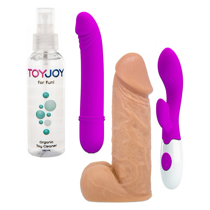 Detalii practice: spray-ul ToyJoy e formulat pentru materiale variate (silicon, latex, cauciuc) și împiedică acumularea bacteriilor; dildo-ul din PVC e rezistent la apă și are inserabil 11 cm; vibratorul mic are inserabil 9 cm și diametrul delicat pentru stimulare focalizată; vibratorul dublu are inserabil 11 cm, design ergonomic și control intuitiv.