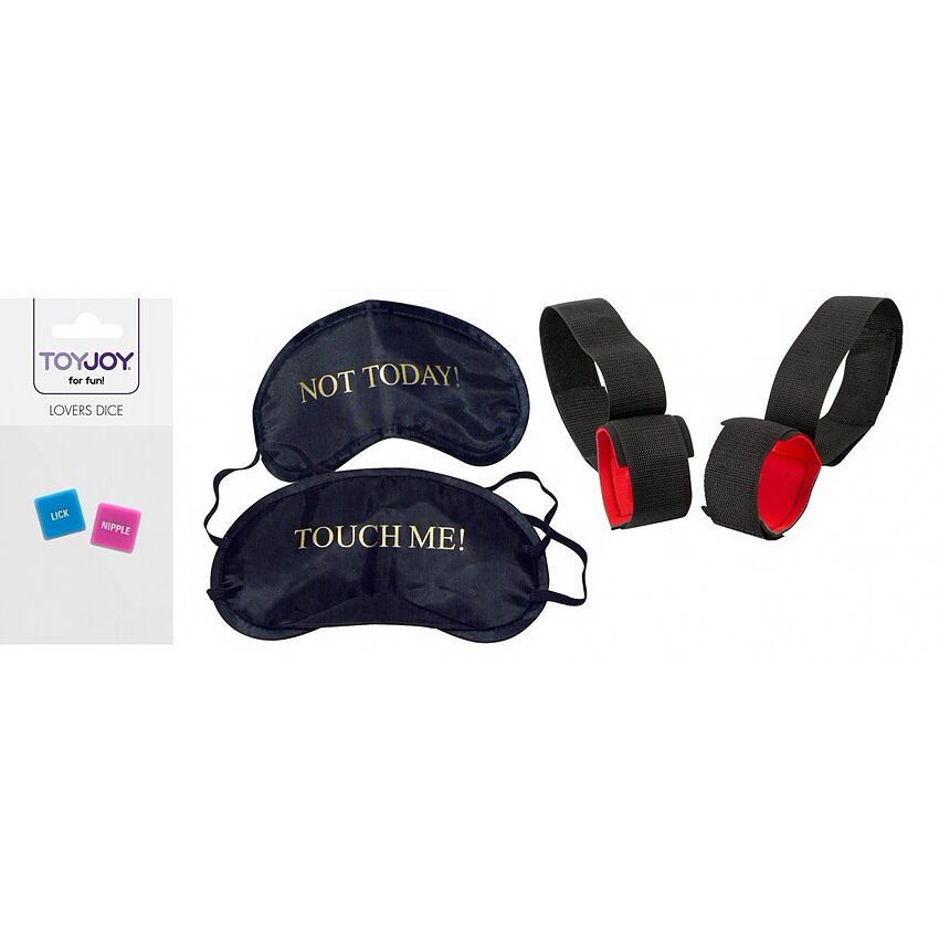Set complet pentru nopți în care misterul și dorința iau controlul: mască opacă, două perechi de cătușe căptușite și zaruri provocatoare. Articolele se întregește normal — ascunde privirea, lasă zarurile să decidă și experimentează trăiri sigure și intense.