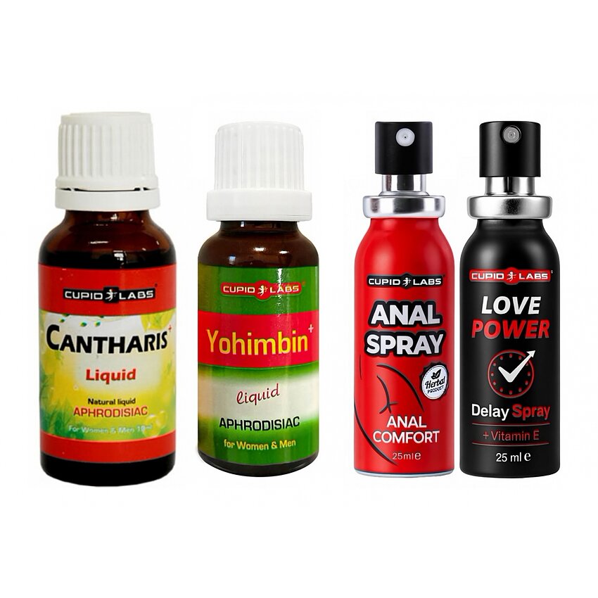 Ce asigură fiecare produs în pachet: - Love Power Delay 25 ml (spray): micșorează temporar sensibilitatea, contribuie la întreținerea controlului și prelungește timpul culminant. Perfect pentru masculii care doresc securitate în performanță. - Spray Desensibilizator Anal Cupid Labs 25 ml: făcut pentru diminuarea disconfortului la penetrare, relaxează zona și permite explorarea anală cu mai multă plăcere. - Cantaridă Plus 20 ml (picături): afrodiziac pe bază de extracte naturale, crește apetitul sexual, puterea și forța senzațiilor pentru ambele sexe. Se administrează înainte de contact pentru concluzie rapid. - Yohimbin Drops 20 ml (picături): extras normal cu rol în amplificarea circulației și a vigilenței sexuale; susține erecțiile și crește vitalitatea. Se consumă înainte de act pentru efectele specifice.