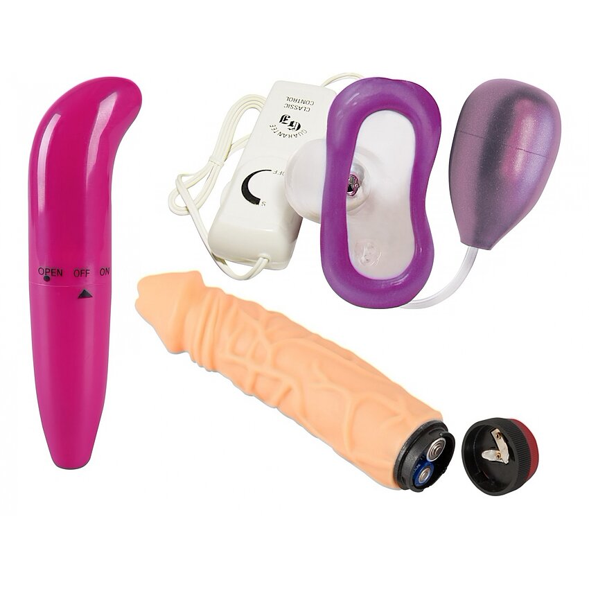Detalii articole și beneficii: - Vibrator 21cm Big Boy: material PVC moale, inserabil 18,5 cm, diametru 4,5 cm, textură cu vene și cap pronunțat pentru senzație realistă. Elastic dar ferm, cu vibrații multi-viteză comandate la bază pentru a regla intensitatea penetrației. - Pompă Aspirație cu Vibrații (roz): cupă cu efect de suctiune care crește receptivitatea clitorisului, vibrații integrate și tele-comandă pentru setări comode. Fabricată din ABS și PVC, mărime 6 cm, diametru 2 cm — perfectă pentru preludiu și pentru a facilita contactul orgasmelor. - Vibrator Punct G Mat Tradițional (roz): corp încovoiat pentru surescitarea precisă a punctului G, din ABS, lungime totală 12,5 cm (inserabil 6 cm), calibru 1,5–2,7 cm. Vibrație puternică, compact și versatil; utilizează baterie AA (neinclusă).