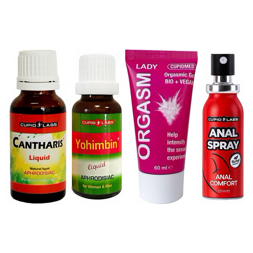 Ce asigură fiecare componentă - Atomizator desensibilizator anal (Cupid Labs, 25 ml): conceput pentru a relaxa sfincterul și a facilita penetrarea cu mai mult confort. Extrem util cuplurilor care vor să exploreze în siguranță, oferind o intrare mai netedă și reducând teama asociată. - Gel Climax Lady (Cupid Labs, 60 ml): textură plăcută, fără parfum, cu formulă hipoalergenică care amplifică sensibilitatea zonelor intime prin efecte de încălzire și furnicătură. Ideal pentru preludiu și stârnire locală, sporește receptivitatea și forța senzațiilor. - Picături Cantaridă Plus (20 ml) și Yohimbin Drops (20 ml): două variante de stimulente reale pentru creșterea poftei și a vigorii. Cantharis activează libidoul erotic și energie rapid, iar Yohimbina ajută circulația locală și poate amplifica răspunsul sexual. Ambele se pot administra în lichid sau sub limbă conform instrucțiunilor pentru rezultate în aproximativ 30 de minute.
